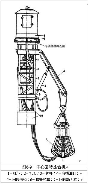 中心回轉(zhuǎn)抓巖機是一種大斗容抓巖機,它直接固定在鑿井吊盤上,以壓風作為動力,該設備具有使用范圍廣、適應性強、設備利用率高、動力單一、結(jié)構(gòu)緊湊、占用井筒面積不大,便于井筒布置、安全可靠、操作靈活、維護方便等優(yōu)點,目前在煤炭礦山得到了普遍的使用。該機由抓斗、提升機構(gòu)、回轉(zhuǎn)機構(gòu)、變幅機構(gòu)、支撐系統(tǒng)和機架等部件組成,見圖6-9。