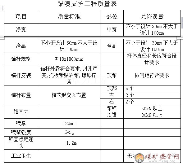 噴漿時在井下設置料場及噴漿站,通過輸料管輸至工作面,噴漿時采用D2-5型噴漿機一臺輸料管采用直徑76毫米焊管,噴時厚度為120毫米拌料配合比水泥:砂:石子為1:2:2.8(重量比)水泥采用DO32.5Q普通硅酸鹽水泥,砂子為中粗砂石子粒徑為5毫米,水灰比控制在0.45,速凝劑摻量為水泥用量的3-5%,噴漿時開機必須先開水后開風,再送電,最后上料。停機時要先停料,后停電,再關風,最后停水。每天必須首先對當天的祼巖進行封閉初噴,一般初噴厚度不小于30-50毫米保證工作面錨桿不失效,噴漿手噴漿時,噴頭出口距噴漿面距離控制在1-1.5米之內(nèi),以減少回彈,噴頭以螺旋式軌跡轉(zhuǎn)動,拌合料要隨拌隨用,砼料在地面料場由人工拌合,下至井下噴漿機處,砼料存放時間不超過24小時(不摻速凝劑),拌合料噴漿完后,要清理干凈噴漿機周圍。