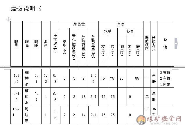 3、裝藥放炮:裝藥放炮工按作業(yè)規(guī)程規(guī)定爆破參數(shù)進行裝藥檢查,放炮時先放掏槽眼,其次輔助眼,再而周邊眼,巷道成形規(guī)整,不得出現(xiàn)超挖欠挖現(xiàn)象。