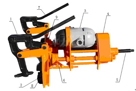 其結(jié)構(gòu):1夾具體、2定位塊、3電動(dòng)機(jī)、4齒輪箱、5進(jìn)給絲杠、6前板鎖緊壓把、7卡緊搬把、8擋銷、9定位銷