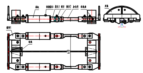 4、將油缸、加長桿用銷子組裝在斜鐵座上,加長桿凹臺部位朝向鋼軌,組裝時兩側(cè)分別組裝,可將另一側(cè)油缸上的油管暫時拆下,開動油泵,調(diào)整活塞桿伸縮量以便插上銷子。