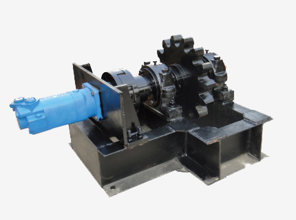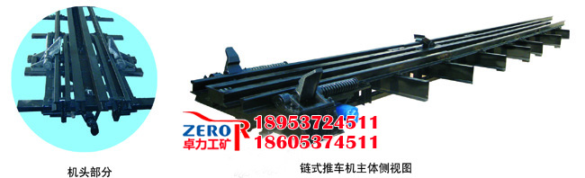 TX型銷齒推車機(jī)是由一列滑到內(nèi)運行的板鏈小車組成,板鏈小車底部在全長內(nèi)設(shè)置等距的銷軸,板鏈上安裝有操車使用的推爪和拉爪,推爪推礦車碰頭,拉爪拉礦車車軸,由液壓馬達(dá)驅(qū)動銷輪轉(zhuǎn)動,使整列板鏈小車前后運動。TX型銷齒推車機(jī)主要用于各種罐籠提升的礦井井上,下車場裝卸礦車和調(diào)運車輛,能夠?qū)崿F(xiàn)裝罐、卸罐、調(diào)運、進(jìn)罐推車、回程拉車等功能。